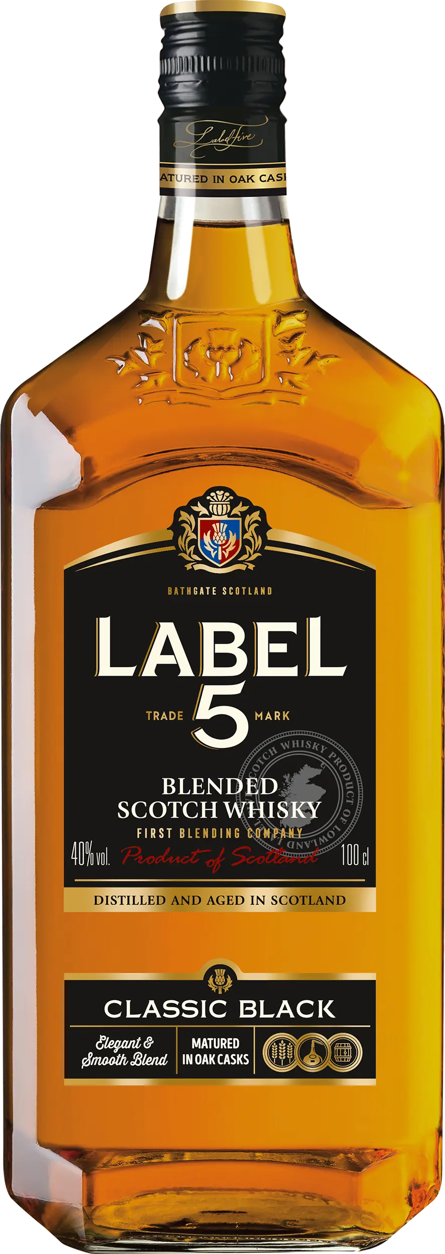 LABEL 5 Classic Black Scotch Whisky matures for over three years in bar- rels previously filled with bourbon, giving it a dark amber colour.